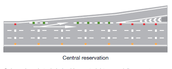 So then, we are currently in lane one on the motorway but it's daylight so the studs are less visible, hang on a mo while I usher in a fog bank and some black clouds (you can do that when you’re a writer you know) Ok that’s more like it, now we can switch on the lights and see the coloured studs reflecting back at us. On our left you can now see(1) Red studs lining the hard shoulder. In keeping with our theme of the five regiments of foot soldiers let’s consider these red studs to be the Welch guards (given the red dragon of the Welch flag). When any exit or entry slip road joins the motorway there is a temporary changing of the guard as the Red, Welch guard, studs turn to (2) Green studs which I will assign as the Irish guards for their green flag. This change from red to green studs occurs only for the length of merging between the slip road and the motorway. I am having a bit of fun with the regiment theme here but just to be clear, it is not intended as a memory technique so it might help you here to relate these two colours to traffic lights, when the lights/studs are green you can exit/enter the motorway, when the lights/studs are red you will find only hard shoulder and no exit point.